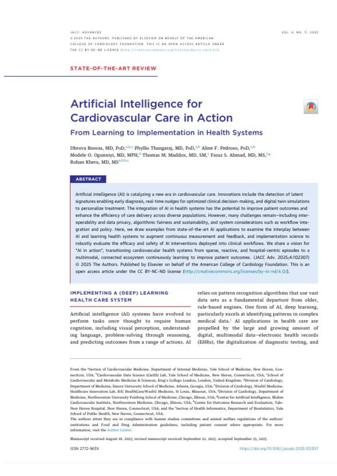 EN BREF : Ce document est une revue de pointe examinant le rôle de l'intelligence artificielle (IA) dans la transformation des soins cardiovasculaires au sein d'un système de santé apprenant (LHS). L'objectif principal est de décrire comment passer d'une médecine réactive et centrée sur l'hôpital à un écosystème connecté et multimodal capable d'apprendre continuellement pour améliorer les résultats des patients. Les thématiques centrales incluent l'utilisation de l'IA pour l'automatisation des tâches de rapport, la détection de signatures de maladies latentes, et l'utilisation de jumeaux numériques pour simuler des traitements personnalisés. Les sources soulignent que l'intégration réussie de l'IA ne dépend pas seulement de l'innovation technique, mais aussi de la science de la mise en œuvre pour garantir la sécurité, l'efficacité clinique et l'équité. L'ouvrage explore également les défis critiques tels que l'interopérabilité des données, la confidentialité, les biais algorithmiques et l'intégration dans le flux de travail des cliniciens. En résumé, il propose une vision de « l'IA en action » où des outils technologiques de confiance agissent comme des copilotes pour augmenter les capacités humaines de perception et de décision