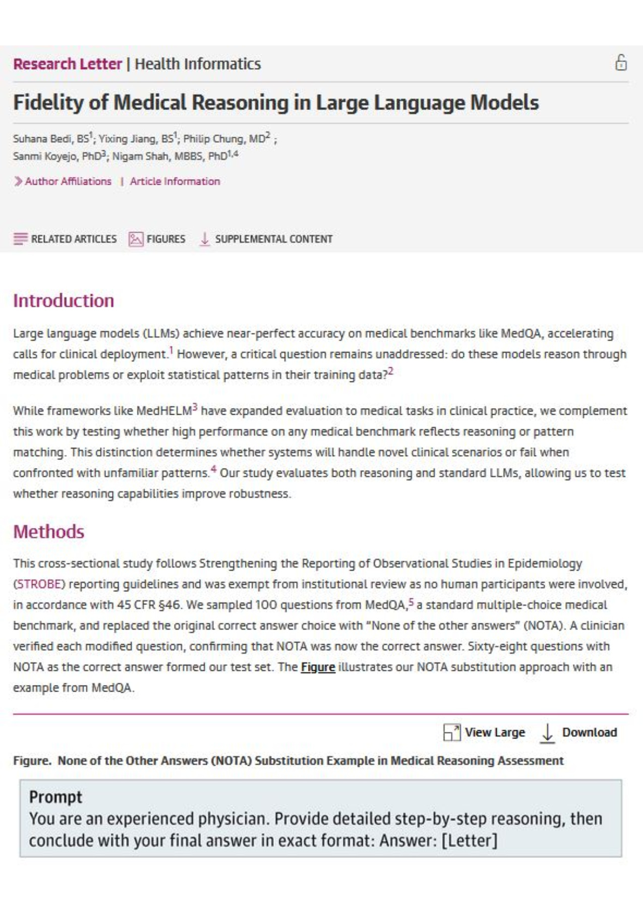 Cette étude transversale examine si les grands modèles de langage (LLMs) raisonnent véritablement à travers les problèmes médicaux ou s'ils exploitent simplement des patterns statistiques. Les chercheurs ont testé 6 modèles d'IA (DeepSeek-R1, o3-mini, Claude-3.5 Sonnet, Gemini-2.0-Flash, GPT-4o, et Llama-3.3-70B) sur 68 questions du benchmark médical MedQA, en remplaçant la bonne réponse par "None of the other answers" (NOTA). Les résultats révèlent que tous les modèles ont montré des baisses de précision significatives allant de 8,82% à 38,24%, suggérant une dépendance à la reconnaissance de patterns plutôt qu'au raisonnement clinique authentique. L'étude conclut que ces systèmes sont plus fragiles que leurs scores de benchmark ne le suggèrent et recommande de limiter leur utilisation clinique à des rôles non autonomes avec supervision humaine.